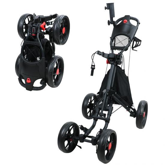 This foldable 4-wheel golf push cart is made of lightweight aluminum, EVA, and plastic, offering durability and portability. Available in multiple color combinations: black with red/black/green/blue wheels or silver with gray wheels. Perfect for golfers seeking a compact, easy-to-carry cart for the course.