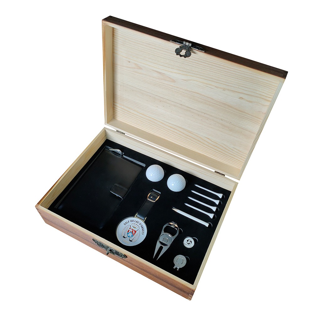 Includes: Ball marker, divot tool, tee, cap clip, scorebook. Material: Beech wood box with EVA lining. Color: Natural wood (customizable). Size: 35x25x11cm. Elegant and practical, perfect for golf enthusiasts. Custom designs available.