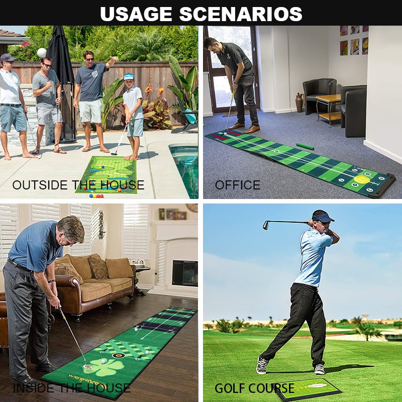This indoor golf putting mat is designed for golfers of all levels to practice consistently at home or in the office. It features a realistic grass surface that replicates true green roll and includes distance markers for precision training.